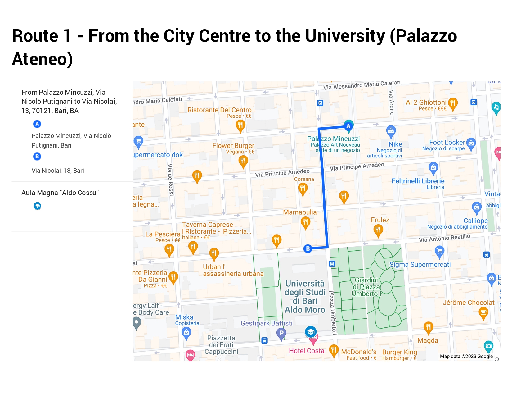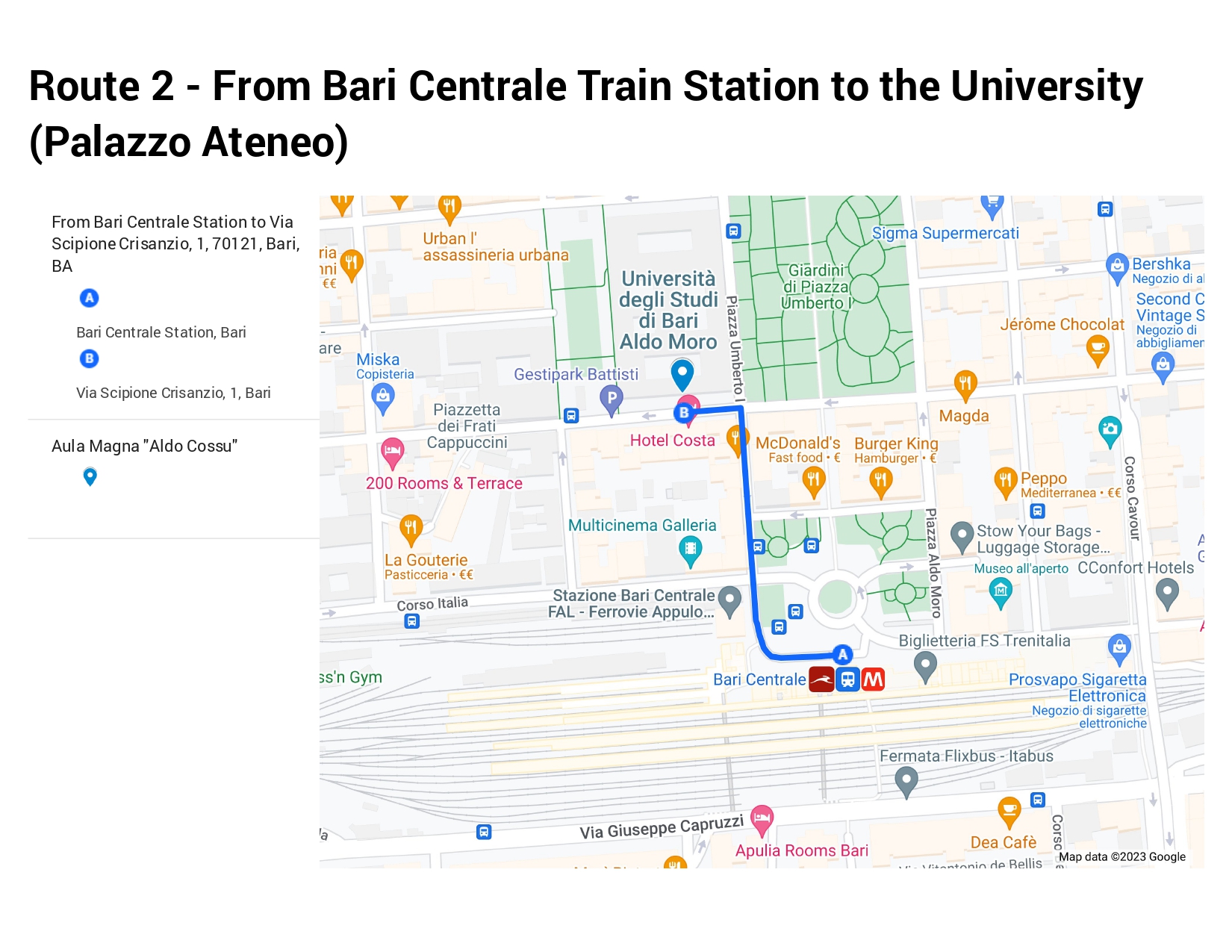 * Per chi arriva in TRENO:dalla Stazione di Bari Centrale, Piazza Aldo Moro, la sede è raggiungibile a piedi in soli 5 minuti.